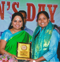 Received International Women’s Day Award From Andhra Pradesh Chief Minister Y.S. Rajasekhara Reddy in 2009.
